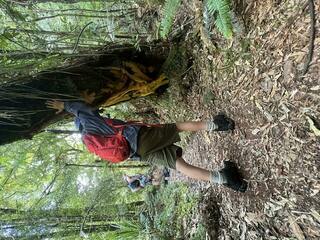 The trail crosses the Rapurapu stream eight times, making for wet feet early on. At the final crossing, the three towering Kauri can be seen from a large boulder in the river ahead of the short board walked climb to their base.