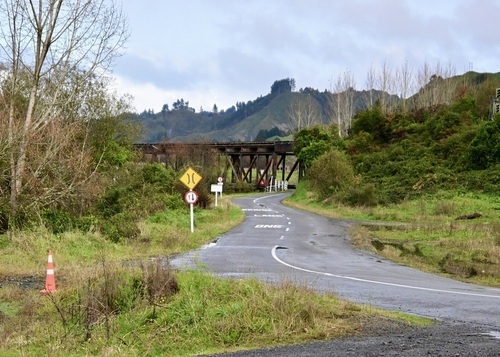 A well-timed glance from SH4 north of Taumarunui reveals the Okahukura rail and road bridge over the Ongarue River. Forming part of the mothballed Stratford-Okahukura line, this double-decker bridge is a curious engineering feat as the road deck sits below the railway line above.